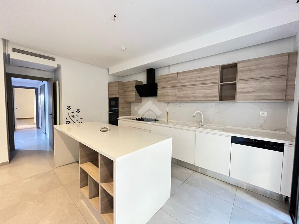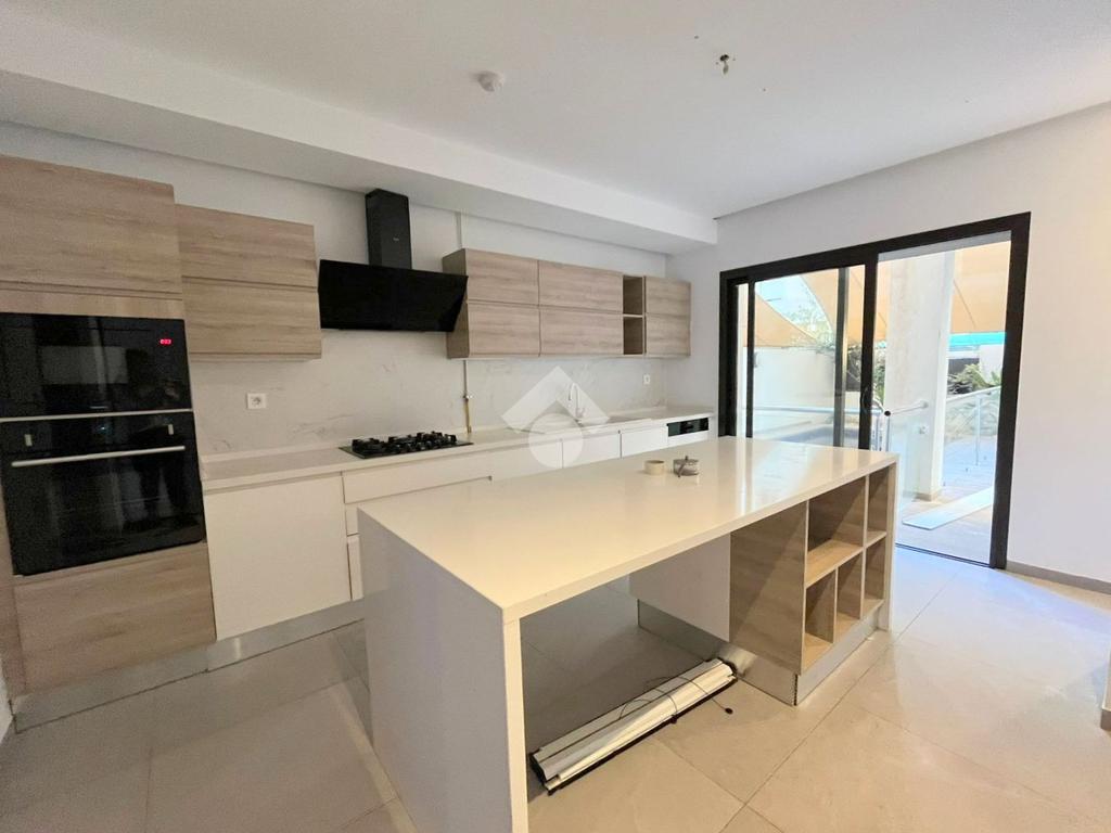 La cuisine est entièrement aménagée et équipée de nombreux espaces de rangement, d’une plaque de cuisson, d’un four électrique et d’une hotte aspirante. Elle dispose également d’un îlot central et offre un accès direct au jardin.
