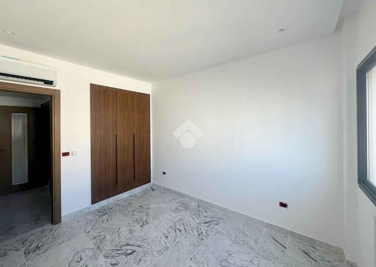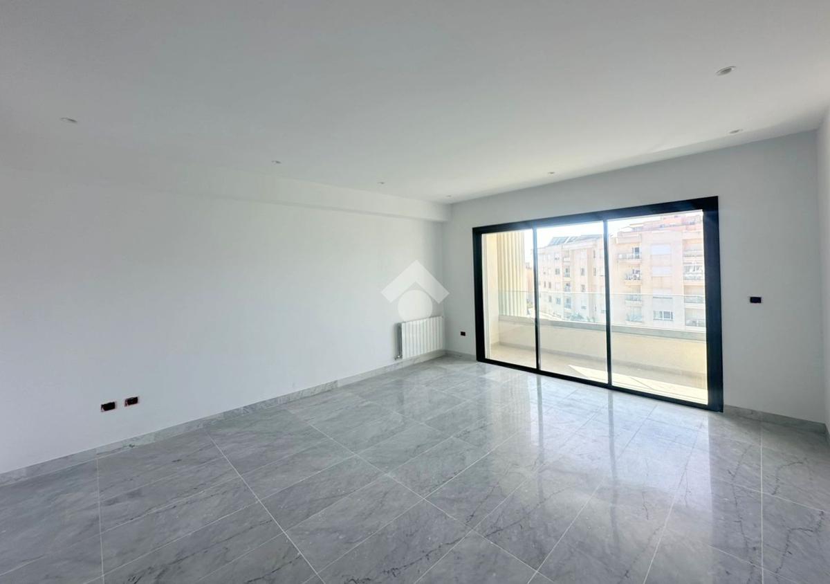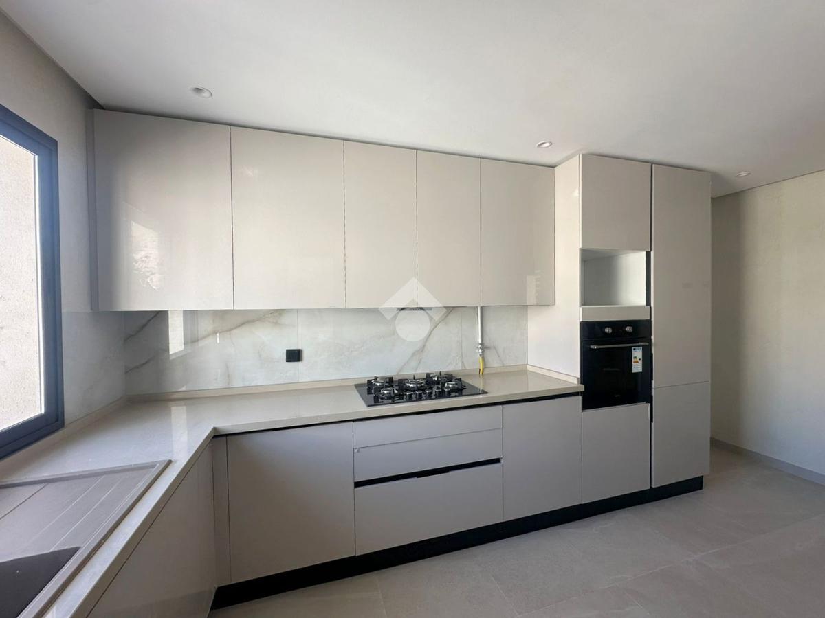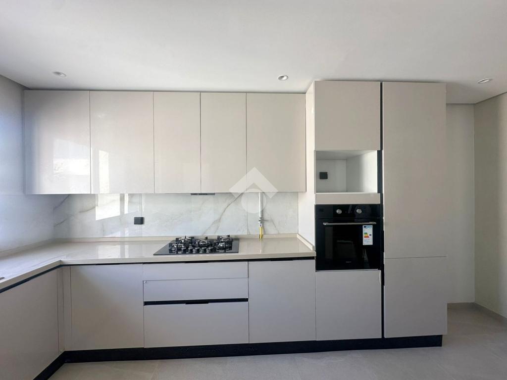 L’entrée s’ouvre sur un hall qui mène à une pièce de vie spacieuse et lumineuse, bénéficiant d’une vue dégagée grâce à son ouverture sur un balcon. La cuisine, entièrement aménagée et équipée, offre de nombreux espaces de rangement et comprend une plaque de cuisson, un four électrique, un micro-ondes et une hotte aspirante. Elle est complétée par un séchoir. Une salle d’eau pour les invités a également été prévue.