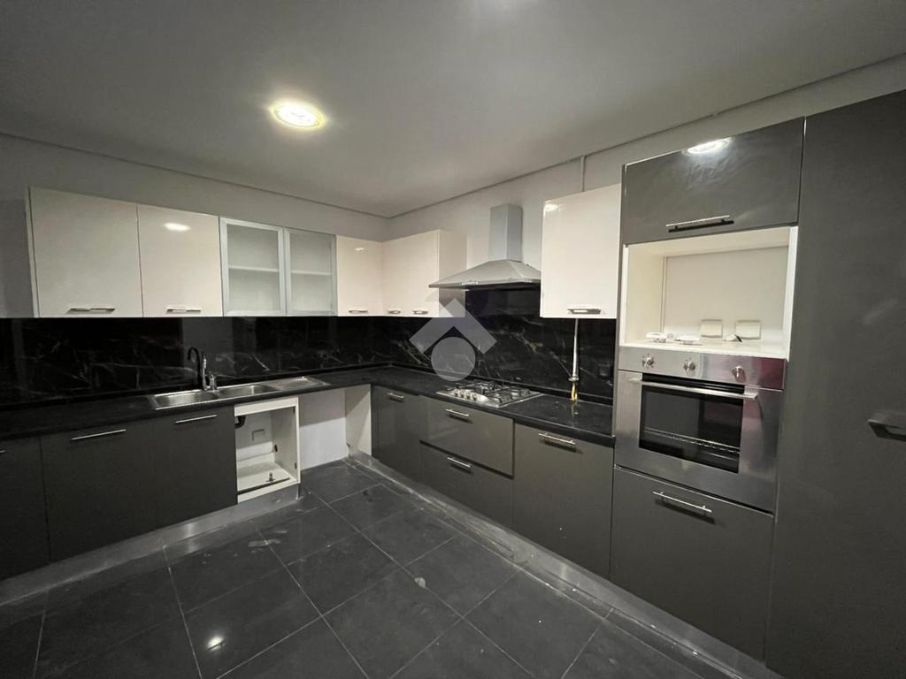La cuisine équipée plaque de cuisson, hotte et four s’ouvre sur une terrasse.