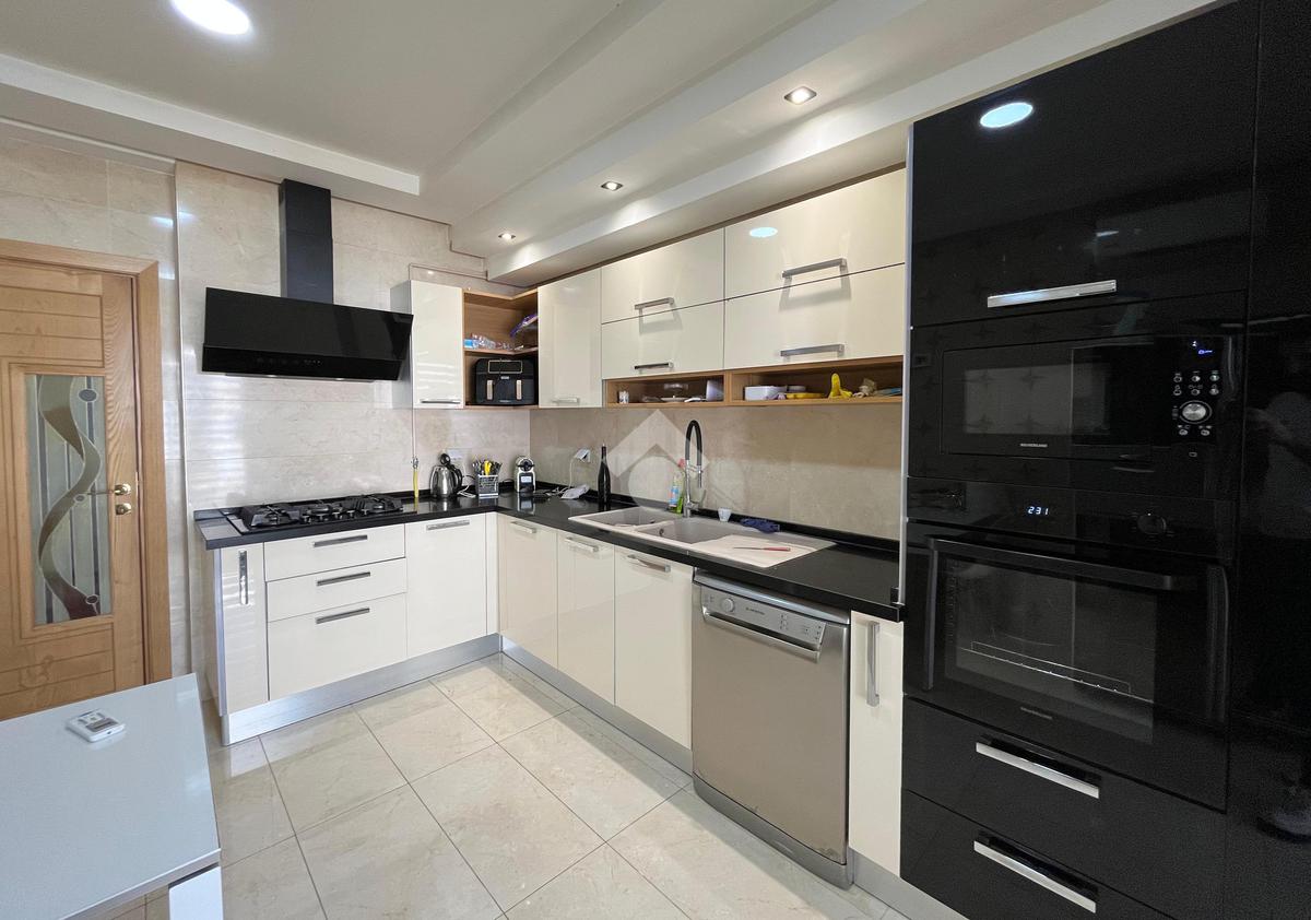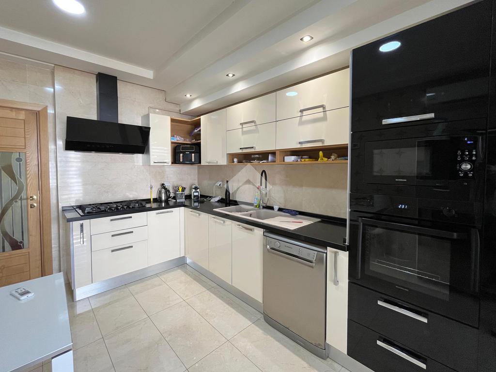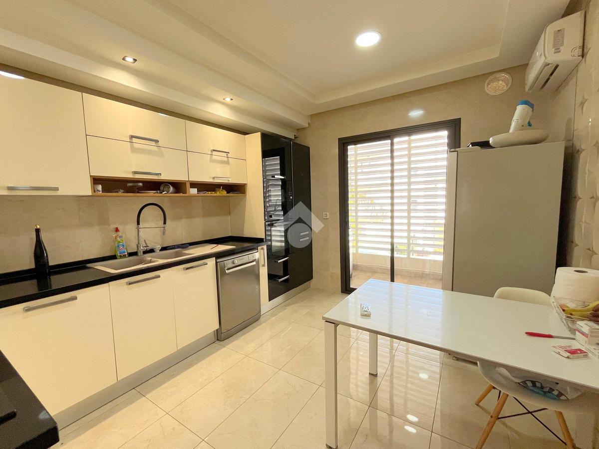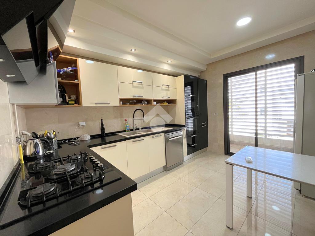 La cuisine est entièrement aménagée avec plusieurs espaces de rangement et équipée d’une plaque de cuisson, d’un four électrique, d’une hotte aspirante et d’un micro-ondes. Elle est complétée par un séchoir exploitable. Une salle d’eau pour les invités complète la partie jour.